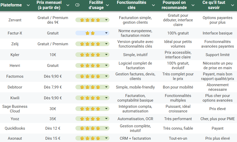 - Commence par du gratuit ou petit prix : Zervant, Henrri et Factur-X sont parfaits pour débuter.
